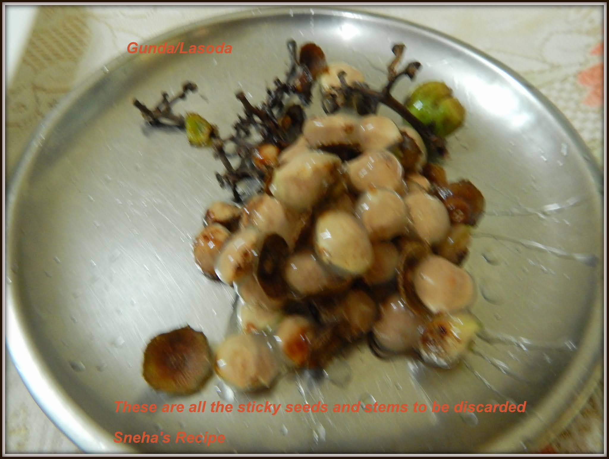 MethodHeat 1 ½ to 2 cups of sesame oil till hot only, do not bring it to a boiling point. Let this oil cool completely.Remove the gunda from the bunch. Wash them very well and dry it. Then take each gunda and with cut it with a knife, press the gunda and remove/discard the seed, cap.