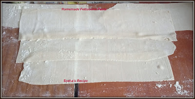Then roll each sheet as shown aboveCut it into fettuccine pasta size cusing a knife.Lightly dust a tray with all purpose flour to prevent the pasta from sticking together. Place the pasta onto the trays and repeat the process until you have used all the remaining dough. Leave to dry for overnight or for a day.Store in a airtight and use whenever required. This will remain outside for a month. My Notes